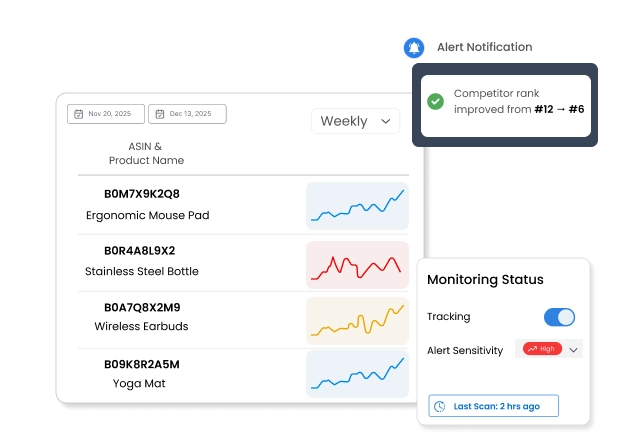 Monitor competitor ASINs and trending keywords across Amazon marketplaces worldwide.