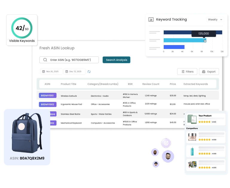 Our Amazon tools help sellers research profitable products, analyze ASIN performance, uncover competitor keywords through reverse ASIN data, and track keyword rankings accurately. You can spot high-demand opportunities, measure competition strength, monitor ranking changes, and optimize listings with clarity. These solutions support smarter launches, better keyword targeting, and steady organic growth. With clear insights into products and search performance, you can make confident decisions and scale your Amazon business efficiently